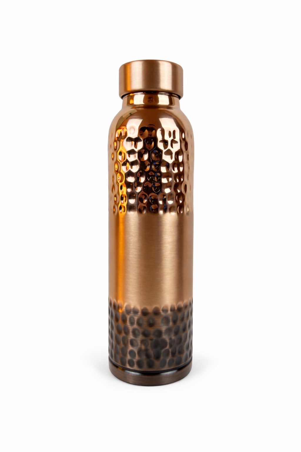 Discover the balance between tradition, functionality, and artisanal design with the Copper Bottle Trio, a premium piece handcrafted from pure copper, created for storing water in a natural and elegant way. Its distinctive three-finish design — hammered, classic satin, and antiqued — transforms this bottle into a statement object that blends modern aesthetics with traditional craftsmanship.
