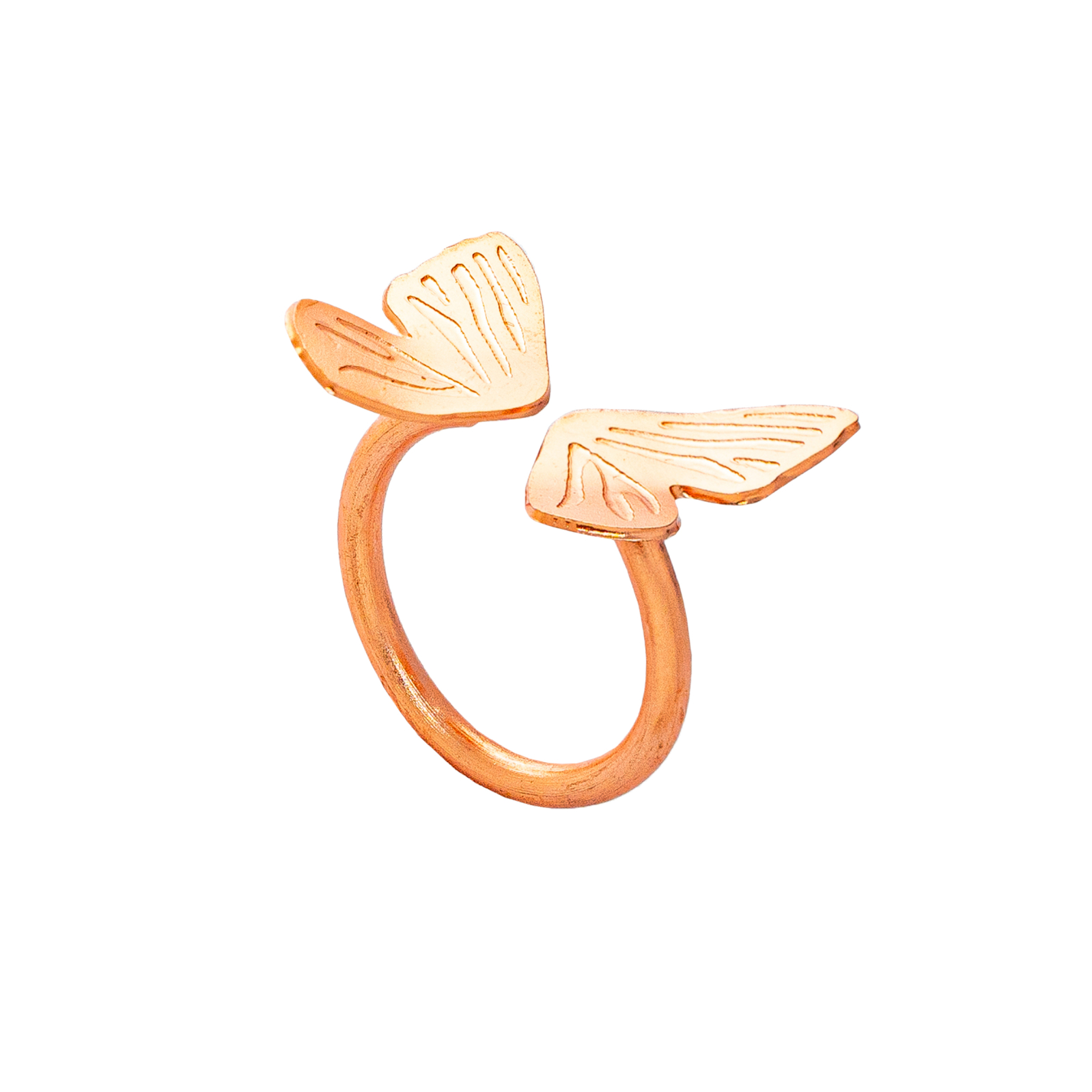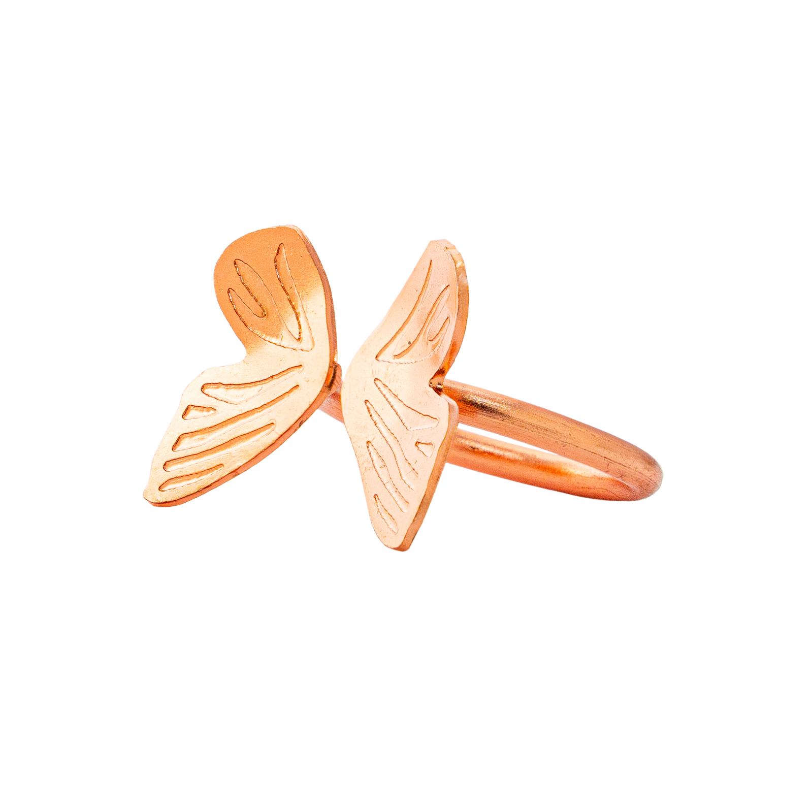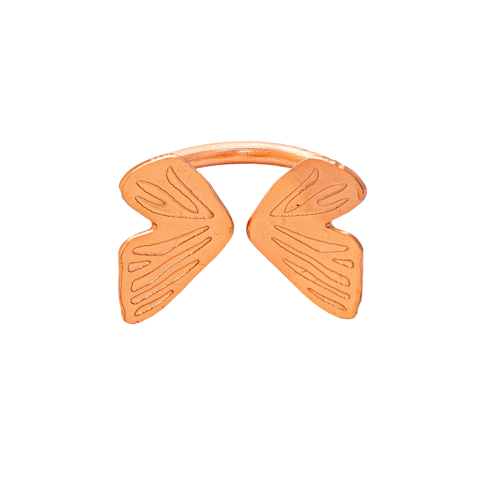 A Lepke gyűrű egy finom, kézzel készített darab tömör vörösrézből, amelyet az átalakulás és újjászületés szimbolikája ihletett. A két gondosan formált szárny letisztult, elegáns formában találkozik — visszafogott, mégis figyelemfelkeltő.