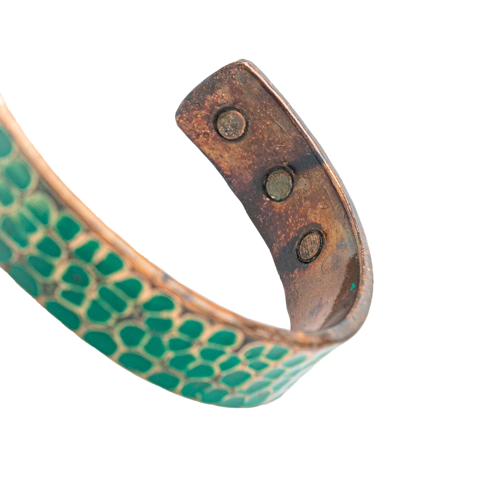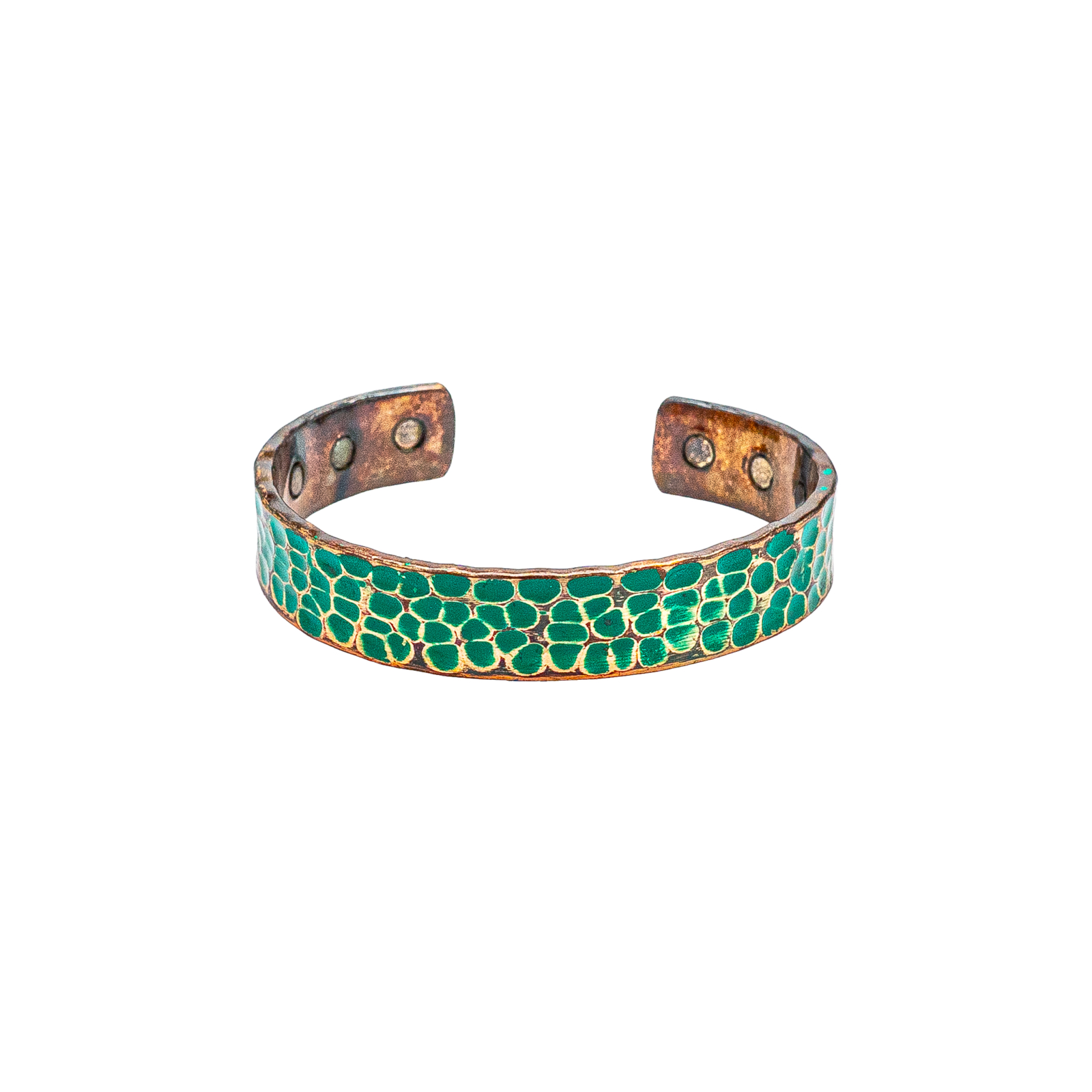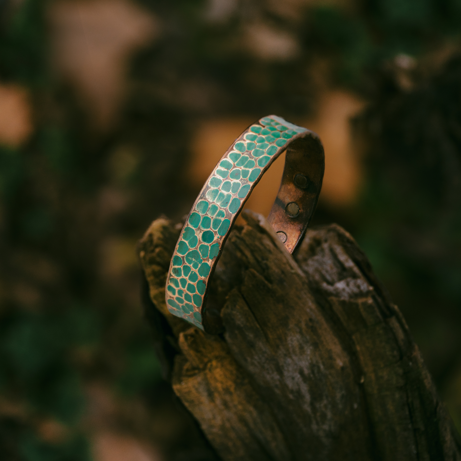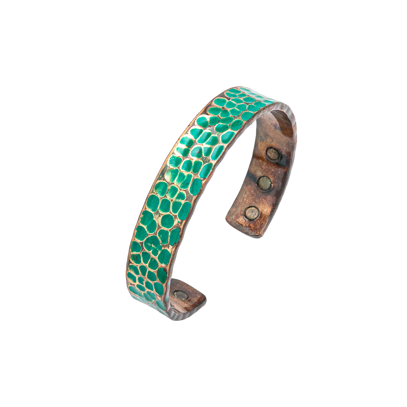 Cuprul natural, în nuanțe calde, contrastează delicat cu verdele intens al modelului smarald, oferind o armonie vizuală aparte. Finisajul antichizat adaugă o notă de autenticitate, făcând ca fiecare brățară să fie o piesă unică, cu caracter și poveste proprie.