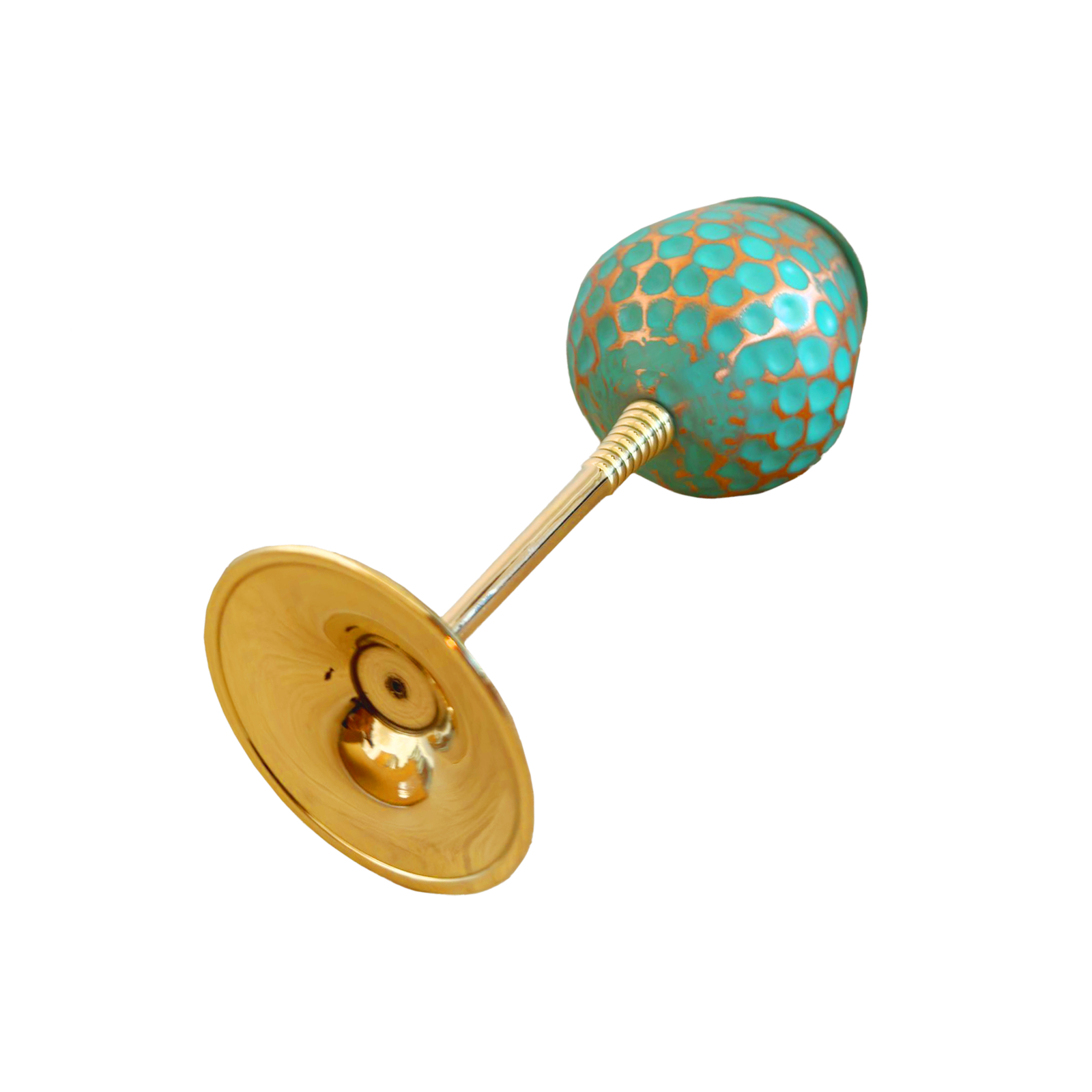 Creat manual din cupru de puritate 99,8% și patină smarald aplicată artizanal, acest pahar îmbină eleganța sofisticată cu tradiția meșteșugului autentic indian. Piciorul din alamă lustruită îi oferă stabilitate și un aer nobil, perfect pentru seri speciale, mese festive sau cadouri premium.