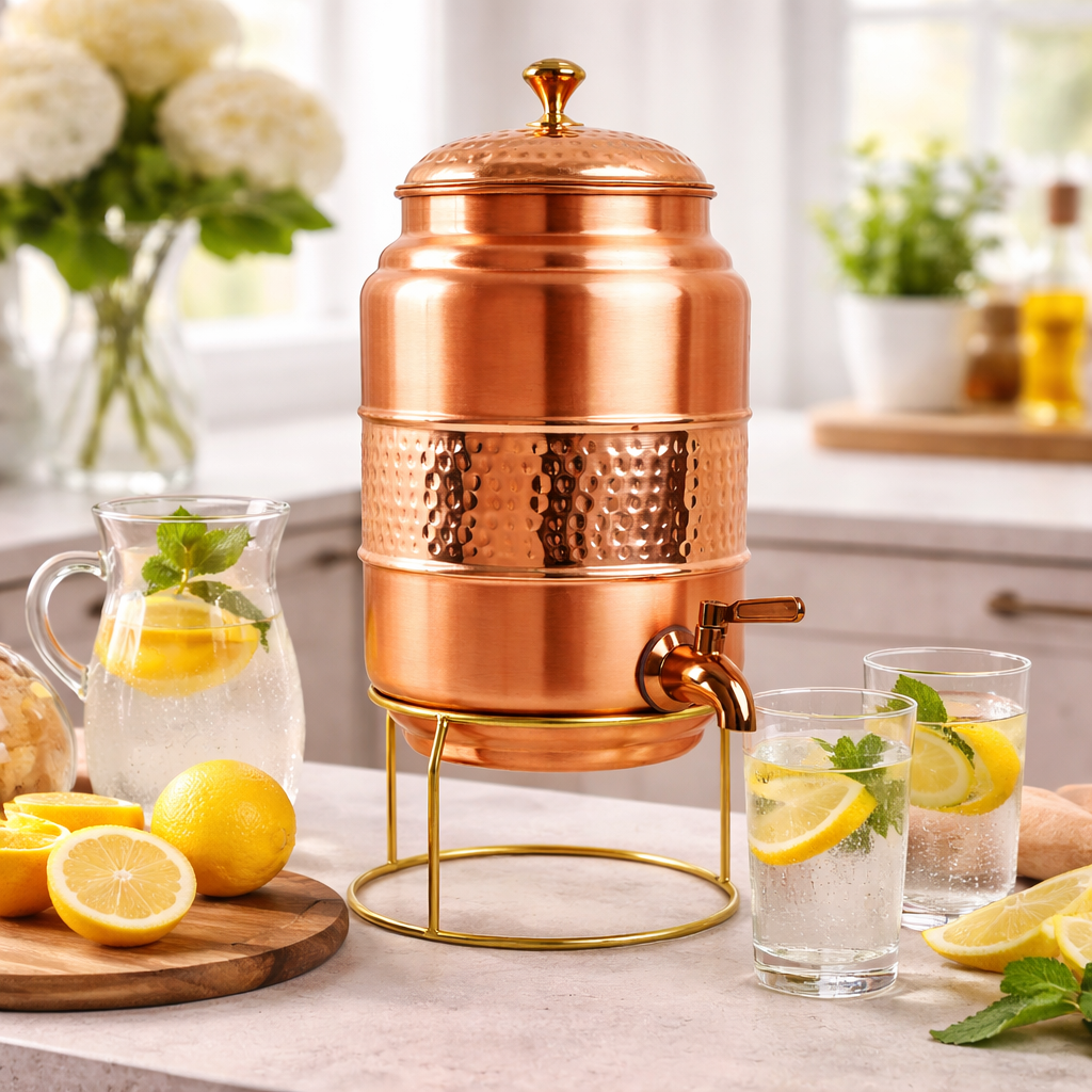 Beneficii pentru sănătate – Consumul apei păstrate în cupru ajută la detoxifierea organismului, îmbunătățirea digestiei și întărirea sistemului imunitar.