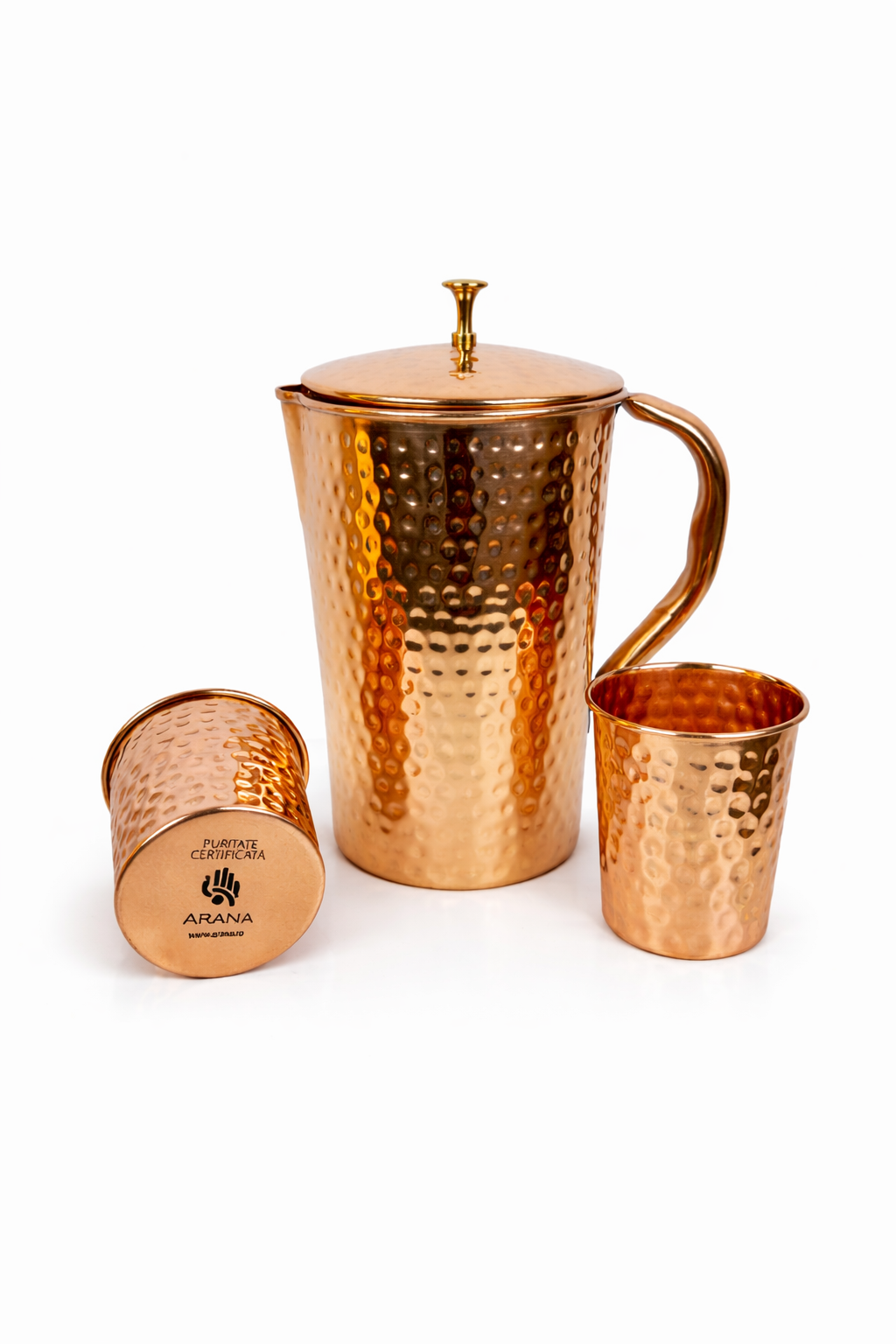 Setul din cupru Hammered este conceput pentru servirea apei într-un mod elegant și coerent. Include o carafă din cupru cu capacitate generoasă de 2 litri și două pahare din cupru de 300 ml, toate cu finisaj ciocănit (hammered), realizat manual.