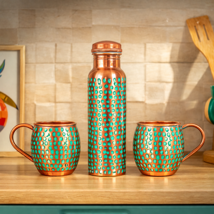 🔸 Sticle de cupru pentru detoxifiere – Recomandate în practica ayurvedică, pentru un stil de viață sănătos.