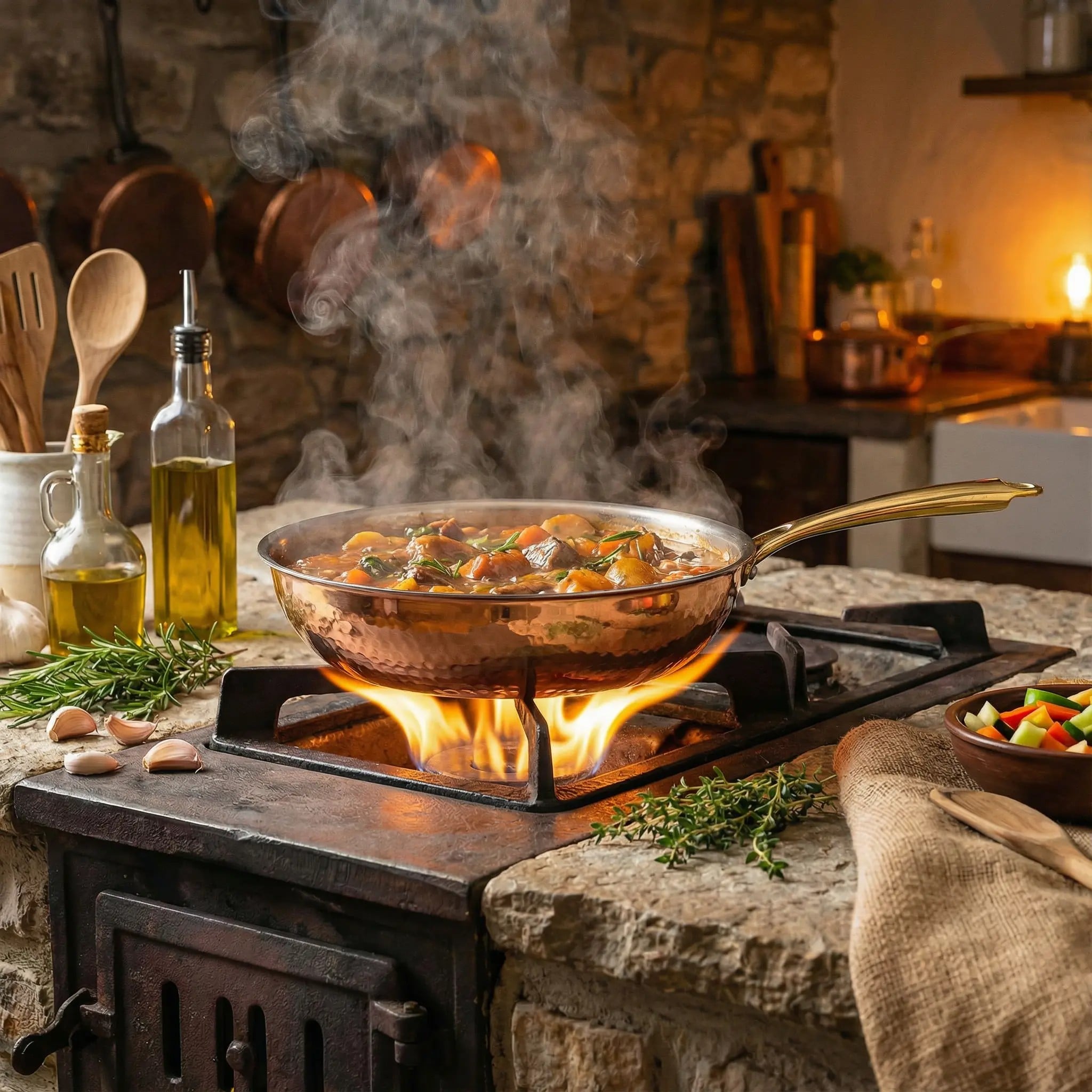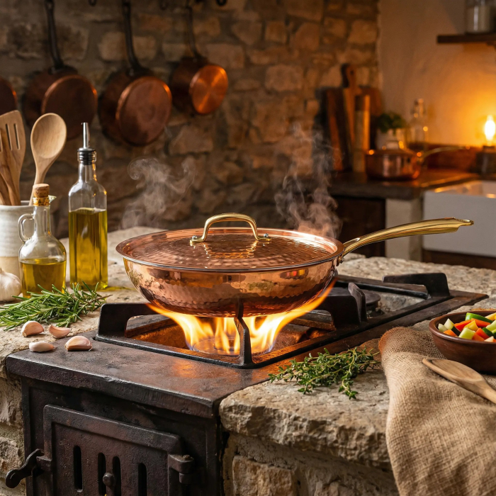 🔸 Design elegant și finisaje premium – Aspectul sofisticat al cuprului lustruit și mânerele solide din alamă transformă această tigaie într-o piesă de rezistență în orice bucătărie.